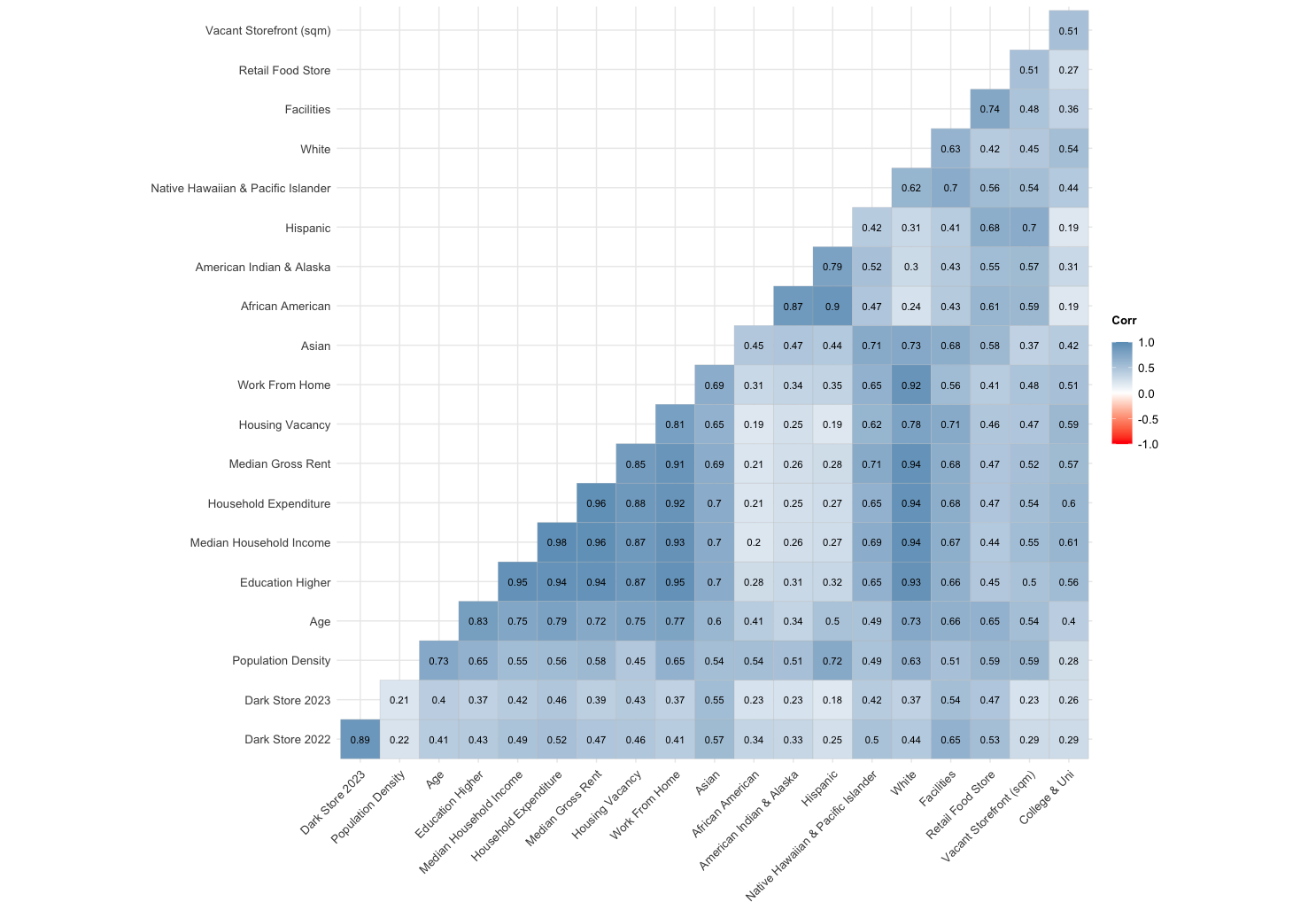 In the correlation analysis, I observed a positive correlation between grocery “dark stores,” points of interest, and several demographic characteristics. This positive correlation is consistent in both 2022 and 2023, with facilities and retail food stores as “points of interest” having a higher correlation than “demographic characteristics.” On the other hand, some variables, such as population density, Hispanic, African American, American Indian and Alaska population, vacant storefronts, colleges, and university have low correlation. These relationships and findings strengthen the factors mentioned in the industry interview, suggesting the importance of density towards other retail food stores and service-oriented businesses or facilities to determine location selection.